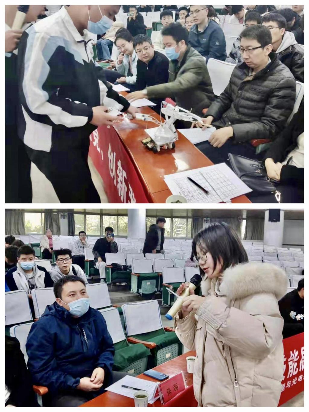 此次大赛共分为物理、电控两个赛组,共11个参赛团队,分为作品讲解、作品演示、评委提问三个环节。各个团队分别展现了各自独具创意的作品,如物理5组制作了以液压为原理的模拟挖掘机;物理3组向大家展示了“线悬浮”结构并对其实际应用进行了详尽讲解;电控5组展示了“AI校园垃圾自处理系统”,体现了较好的应用性;电控6组制作的“精灵盒之智能家居控制系统”,对AI家具实现了“一体多控”的功能。在提问环节,评委们就参赛选手现场表现及作品实际功能提出了宝贵意见,选手们也就评委的问题一一进行了回答。