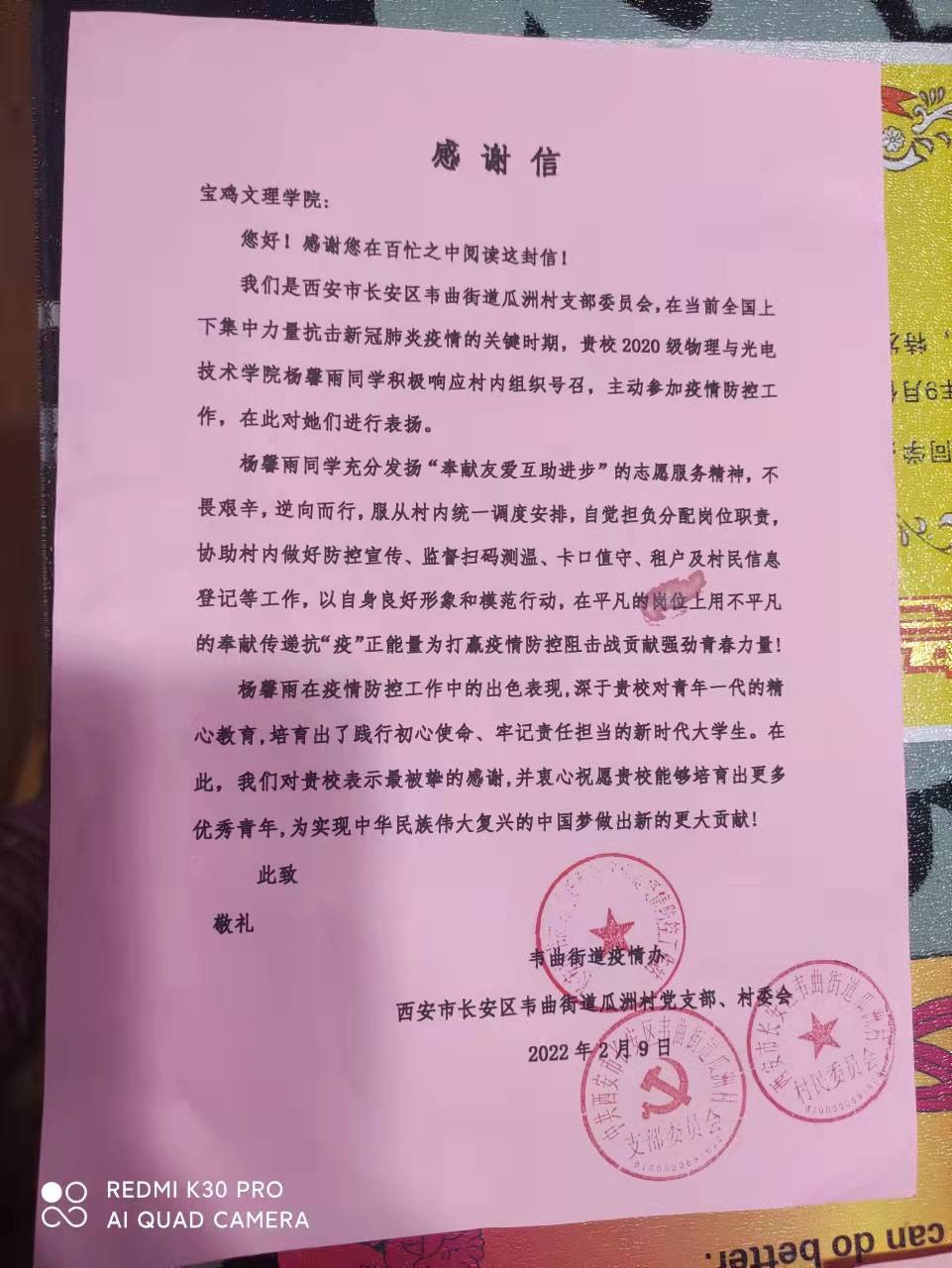 近日,best365收到一封西安市长安区曲街道瓜洲村支部委员会发出的感谢信,信中表达了对best3652020级电子科学与技术专业杨馨雨同学在疫情防控工作中的出色表现予以充分认可,同时对公司培养出践行初心使命、牢记责任担当的新时代老员工表示真挚的感谢。