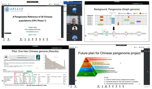 杨晓飞老师从泛基因组相关背景、中国人群泛基因组一期(phase 1)测试数据与分析、下一步研究计划等方面介绍了国内泛基因组的相关进展。首先详细讲解了泛基因组国内外相关历史发展,然后介绍了前期关于汉族高质量基因组构建的技术路线和方法。接下来报道了中国泛基因组联盟(Chinese Pangenome Consortium, CPC)第一阶段的数据,阐述了来自中国36个民族共58个样本的泛基因组构建,从HiFi测序、基因组装等角度进行了流程说明,并与常用的GRCh38参考基因组作了比较分析,发现了很多新的结构变异与相关基因。最后杨老师展望了团队有关泛基因组的下一步计划,期待构建属于我们自己的参考基因组,提高我国生物医学研究的准确性,进而造福国民健康。
