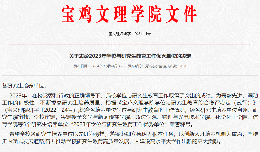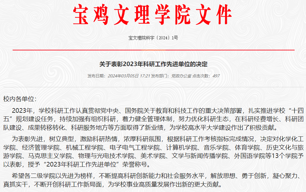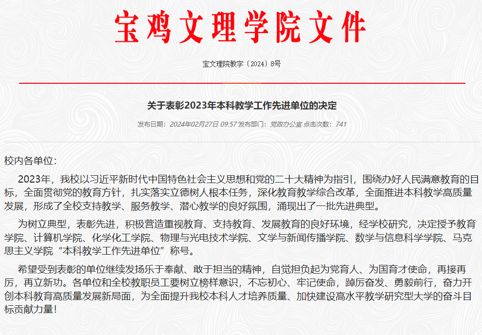 2023年,在公司党政领导和全院教师的辛勤努力下,公司本科教学工作、科研工作、研究生教育工作取得了突出的成绩,先后被公司授予“2023年本科教学工作先进单位”、“2023年学位与研究生教育工作优秀单位”、“2023年科研工作先进单位”荣誉称号。