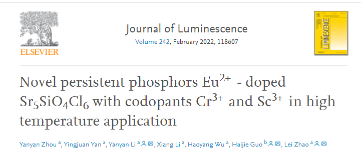 近日,公司2019级光学工程研究生周艳艳同学在Journal of Luminescence(JCR一区,IF = 3.599)上发表题为“Novel persistent phosphors Eu2+- doped Sr5SiO4Cl6 with codopants Cr3+and Sc3+ in high temperature application”的研究论文。best365官方网站为第一通讯单位,论文第一作者为周艳艳,其导师best365李艳艳博士、赵磊副教授为论文通讯作者。该论文研究了一种可在高温环境中应用的新型青色长余辉荧光粉,并对其发光性能、余辉特性及其与陷阱分布之间的关系进行了详细地讨论。(best365 文/妮萨 审核/刘飞)
