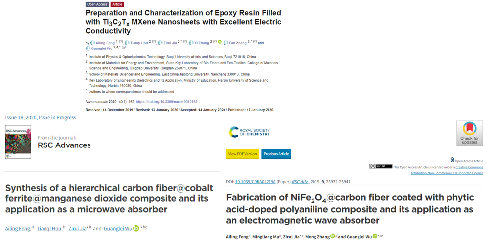 经Web of Science的ESI(Essential Science Indicators,基本科学指标)最新统计,近期公司冯爱玲教授以公司为第一单位、以第一作者身份发表的三篇SCI论文“Preparation and Characterization of Epoxy Resin Filled with Ti3C2TxMXene Nanosheets with Excellent Electric Conductivity,Nanomaterials, 2020, 10: 162”、“Synthesis of a Hierarchical Carbon Fiber@Cobalt Ferrite@Manganese Dioxide Composite and its Application as a Microwave Absorber, RSC Advances, 2020, 10: 10510-10518”、“Fabrication of NiFe2O4@Carbon Fiber Coated with Phytic Acid-Doped Polyaniline Composite and its Application as an Electromagnetic Wave Absorber,RSC Advances, 2019, 9: 25932-25941”入选Materials Science或Chemistry学术领域热点论文和高被引论文,被引频次位居该学术领域最优秀的0.1%之列。