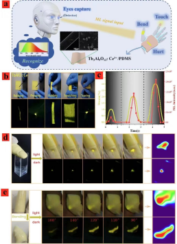 机械发光材料由于具有自恢复、可视化、非接触传感等特性,有望作为光学传感技术的载体,在机械传感领域得到了广泛的研究。然而,温度、湿度、腐蚀性物质等人类生活环境对光学传感材料的影响是不可忽视的,这极大地影响了光学传感的精度。为了克服这些因素精度的障碍,该论文提出了一种基于Ce3+掺杂石榴石结构发光材料Tb3Al5O12的柔性机械发光复合器件,该器件在明暗环境下都具有高亮度的机械发光特性。在反复的机械刺激作用下,机械发光强度表现出良好的自恢复性能,在0-100°C范围内,机械发光强度表现出零热猝灭性能。此外,论文还对该复合器件在水中不同时间的抗湿性进行了评价,证明其机械发光的强度几乎不受潮湿环境的影响。基于此,该论文提出了一种基于机器人手指弯曲的模拟人类触觉系统的应用。研究结果表明,基于Tb3Al5O12: Ce3+的机械发光复合器件在先进光学多模传感器以及机器人末端触觉传感领域有着一定的应用前景。