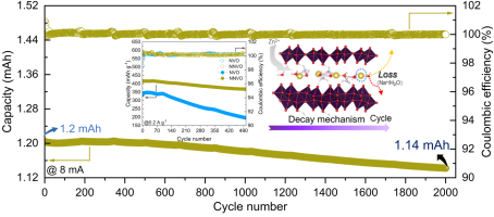 水系锌离子电池具有本征安全、成本低、环境友好等优点,是大规模电站储能的新选择。目前,高容量(>400 mAh/g)、稳定(>500圈)的正极材料仍然是一个重大挑战,制约了水系锌离子电池的发展。本文采用顺序水热法制备了一种新型杂化三元共插层的钒氧化物正极Nax(NH4)2−xV10O25·8H2O。该材料中H2O、NH4+和Na+的三元共嵌入可以扩大钒氧化物层间距,同时促进Zn2+存储活性位点、晶格结构稳定性和Zn2+迁移能力,使该材料在0.1 A/g电流密度下表现出481.2 mAh/g的比容量,且在2.0 A/g电流密度下的2000次循环容量保持率达到95%,具有良好的实用价值。此外,该工作还揭示了嵌入元素损失主导的容量衰减机制,为提高层间可调正极材料的容量和稳定性提供了一种可行的共插层策略和调控方法。
