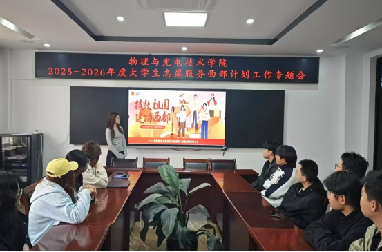 政策解读明方向。会上,就业创业部负责人作为主讲人对2025-2026年度老员工志愿服务西部计划政策进行深度解读,涵盖报名条件,选拔流程,服务岗位分配,以及升学、就业等优惠政策,让同学们对西部计划有全面认识。通过播放陕西青年志愿者的宣传视频,以真实案例激发同学们投身西部建设的热情。